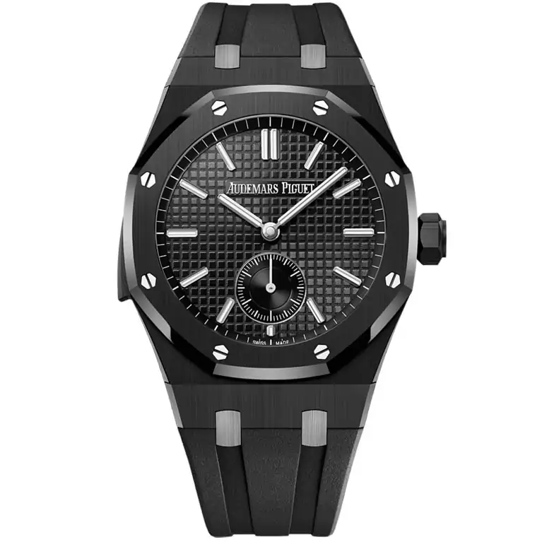 • Được làm bằng gốm đen. Mặt số màu đen với hoa văn "Grande Tapisserie", vạch chỉ giờ bằng vàng trắng và kim Royal Oak phủ phát quang.