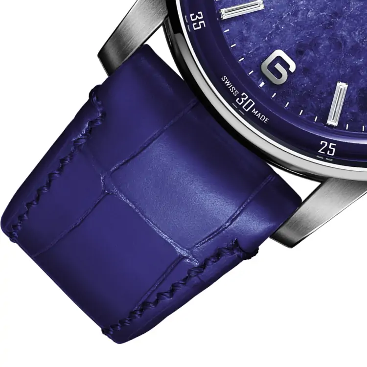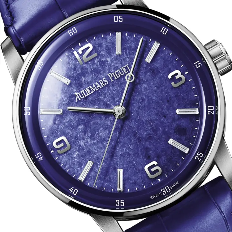 • Được làm từ Vỏ, đai kính, vấu và nắp sau bằng vàng trắng 18 cara. Mặt số bằng đá Sodalite với vạch chỉ giờ bằng vàng trắng hoặc kim cương cắt baguette, gờ bên trong sơn mài màu xanh lam, kim bằng vàng trắng