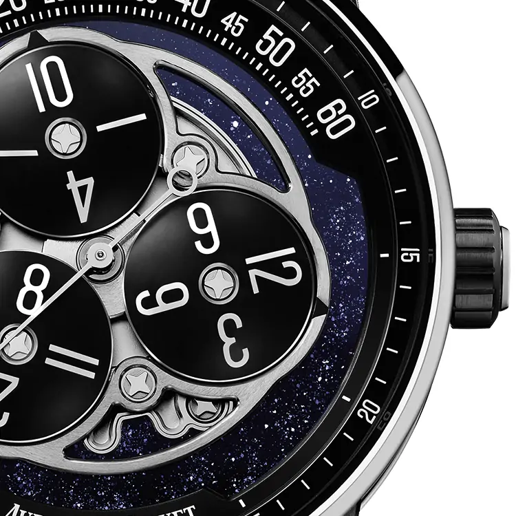 • Được làm từ Núm và giữa vỏ bằng gốm màu đen, đai kính, vấu và nắp sau bằng vàng trắng 18 cara, Mặt số aventurine màu xanh lam, đĩa nhôm trắng đục màu đen, kim đồng hồ bằng vàng trắng 18 cara và gờ bên trong màu đen.