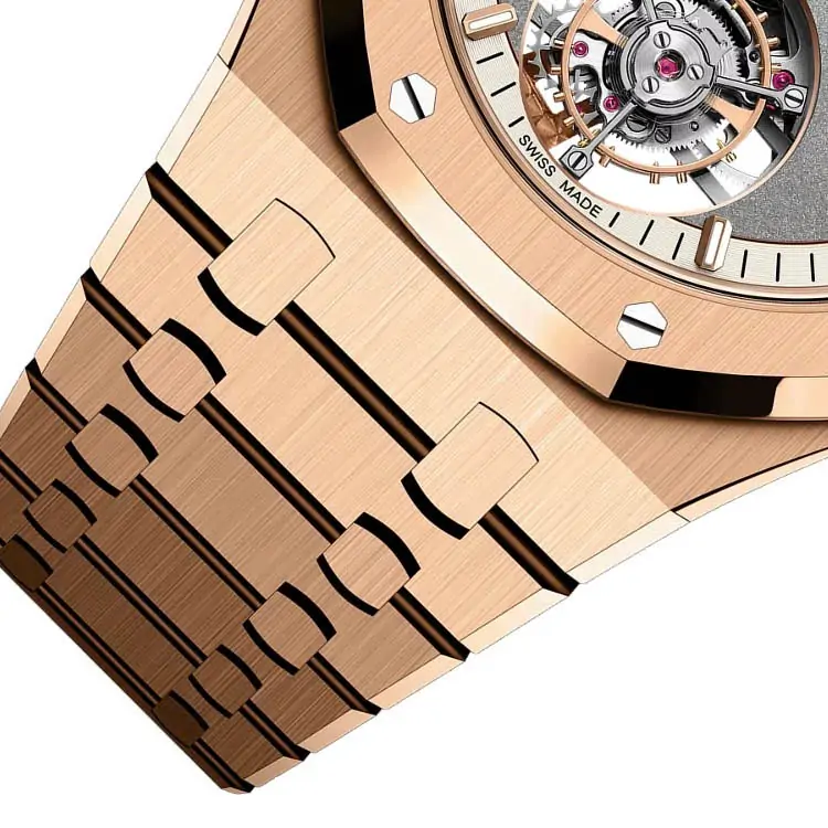 • Được làm bằng vàng 18 carat. Mặt số màu xám được phun cát, vạch chỉ giờ bằng vàng hồng và kim Royal Oak có lớp phủ phát quang.