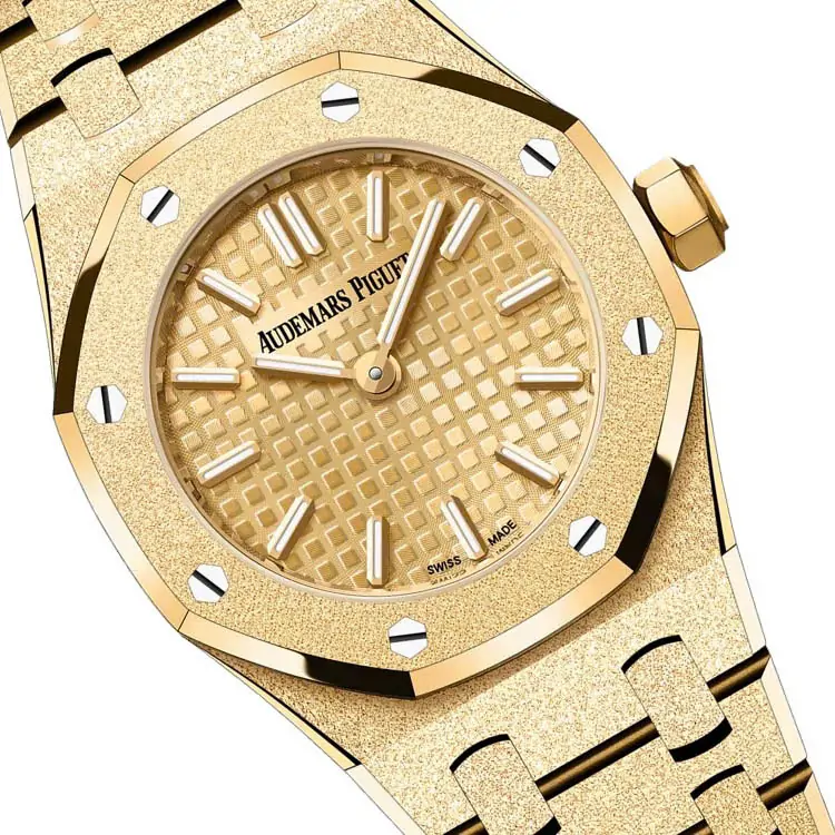 • Được làm bằng vàng 18 cara. Mặt số màu vàng với hoa văn "Petite Tapisserie", vạch chỉ giờ bằng vàng và kim Royal Oak phủ phát quang.