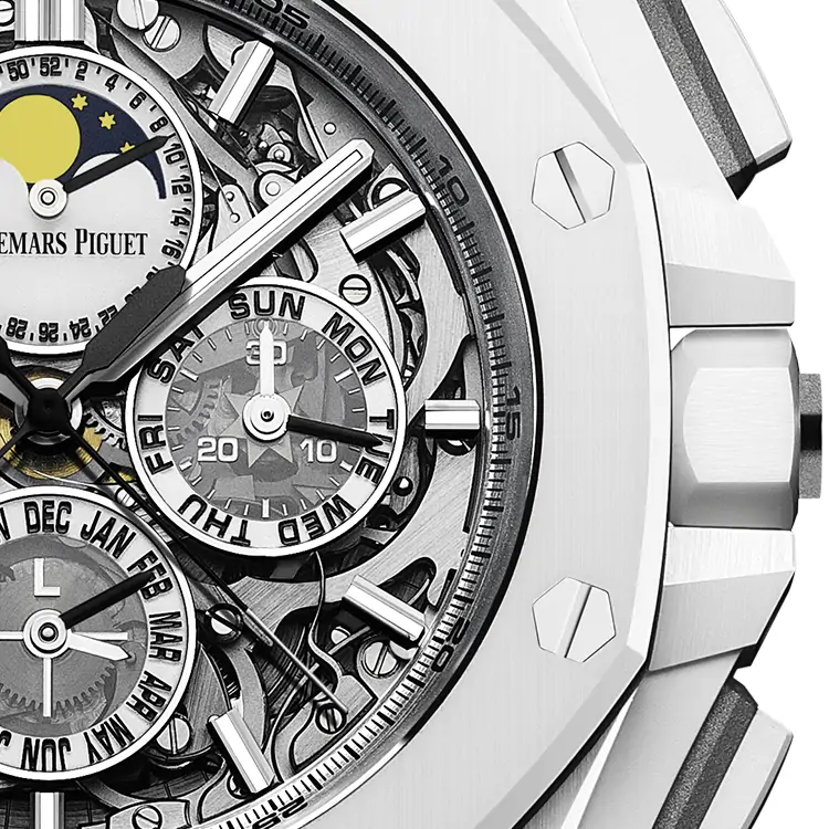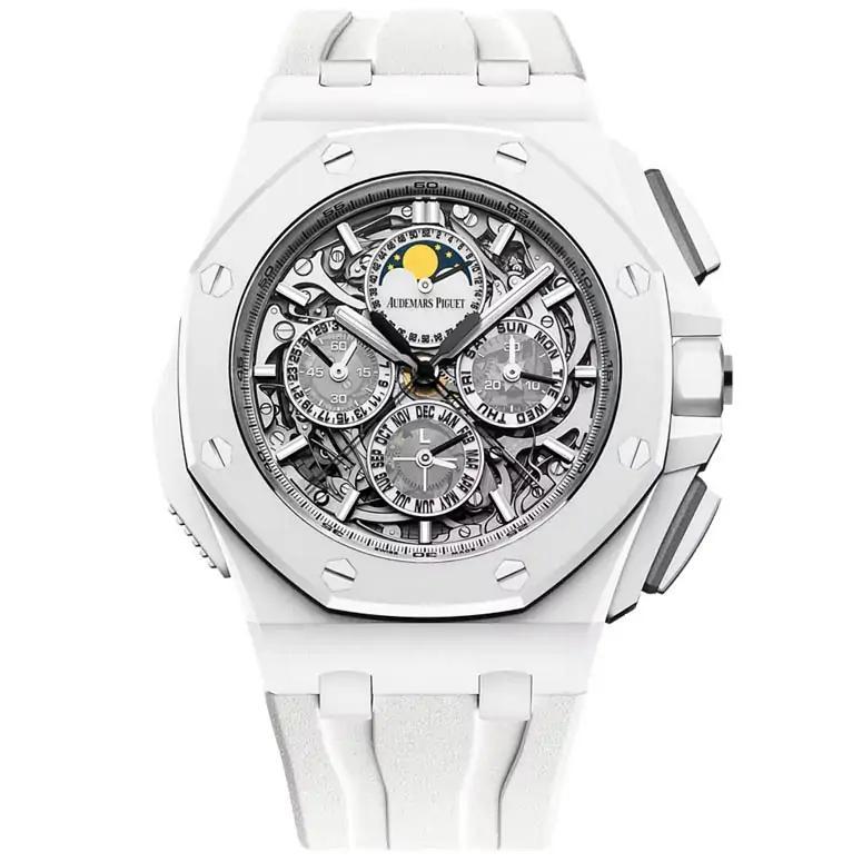 • Được làm từ Vỏ gốm trắng, núm vặn và núm vặn bằng gốm và titan trắng, bộ phận bảo vệ núm đẩy bằng sứ trắng. Mặt số bằng sapphire, bộ đếm màu trắng, vạch chỉ giờ bằng vàng trắng và kim Royal Oak, gờ bên trong có tông màu bạc.