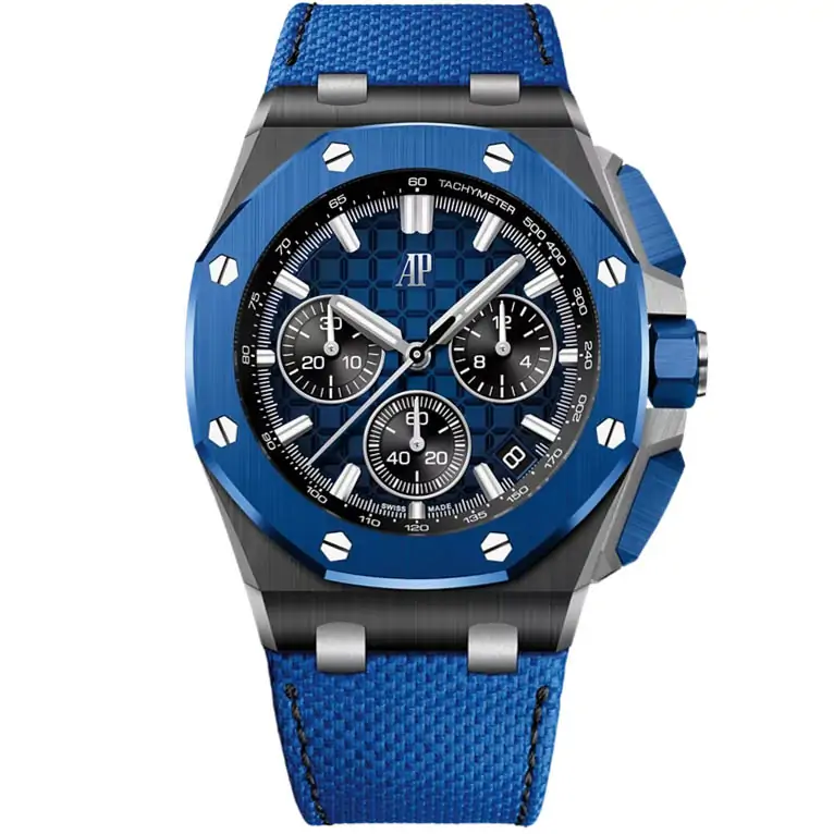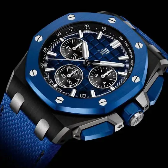 • Được làm từ Vỏ và gờ bằng gốm đen, các núm đẩy bằng gốm đen và núm vặn khóa bằng vít, các tấm bảo vệ, đinh tán và nắp sau bằng titan. Mặt số màu xanh với hoa văn “Méga Tapisserie”, mặt số màu xanh và vùng bên ngoài, vạch chỉ giờ bằng vàng trắng và các kim Royal Oak với lớp phủ phát quang, gờ bên trong màu đen.
