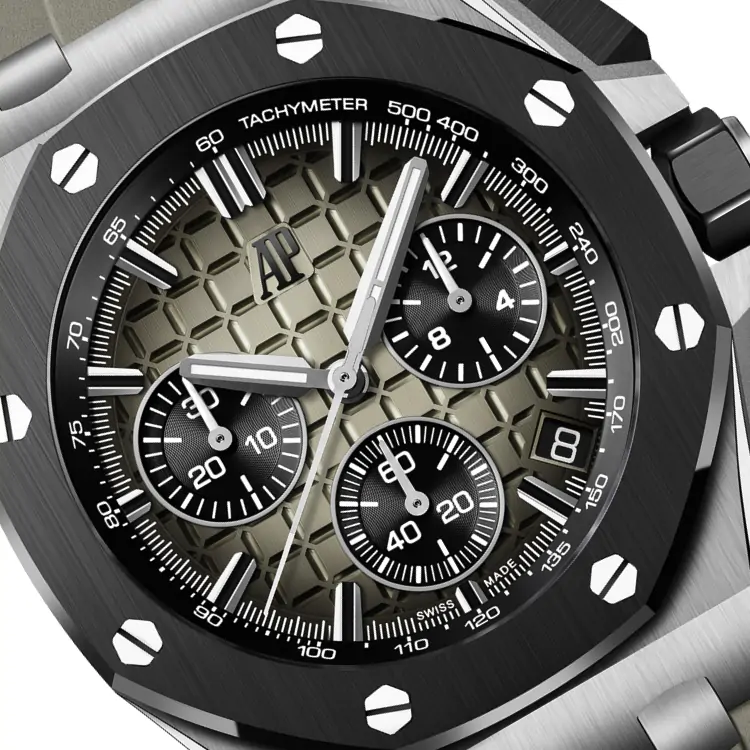 • Được làm từ Vỏ thép không gỉ, gờ gốm đen, núm điều chỉnh và núm vặn khóa bằng vít, bộ phận bảo vệ cần đẩy bằng thép không gỉ được phun cát. Mặt số màu nâu nhạt màu khói với hoa văn “Méga Tapisserie”, mặt số màu đen và vùng bên ngoài, vạch chỉ giờ bằng vàng trắng, kim Royal Oak bằng vàng trắng với lớp phủ phát quang, gờ bên trong màu đen