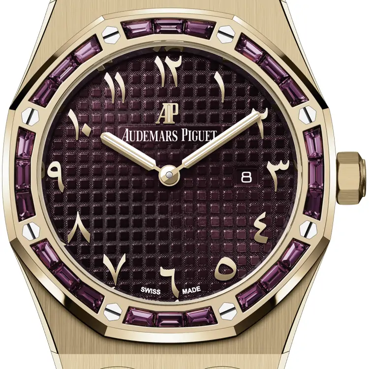 • Được làm từ Vỏ, gờ và vòng đeo tay đều được làm bằng vàng hồng 18 cara với gờ cũng kết hợp với những viên ngọc hồng lựu màu tím cắt baguette mang đến vẻ ngoài xa hoa và bắt mắt. Mặt số màu tím với hoa văn “Grande Tapisserie”, vạch chỉ giờ bằng chữ số Ả Rập phía đông bằng vàng hồng và kim Royal Oak với lớp phủ phát quang.