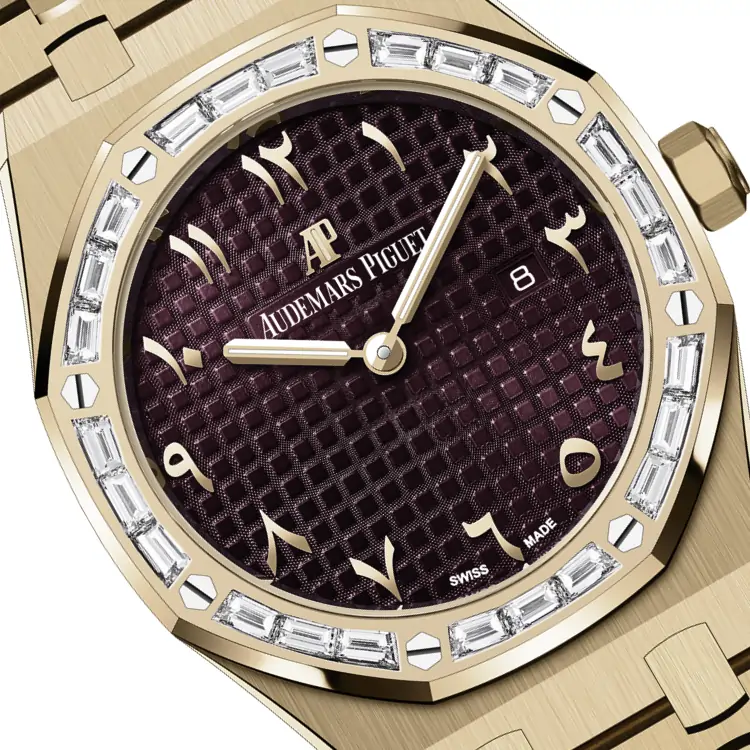• Được làm từ Vỏ bằng vàng hồng 18 cara, gờ được nạm kim cương cắt baguette. Mặt số màu tím với hoa văn “Grande Tapisserie”, vạch chỉ giờ bằng chữ số Ả Rập phía đông bằng vàng hồng và kim Royal Oak với lớp phủ phát quang.