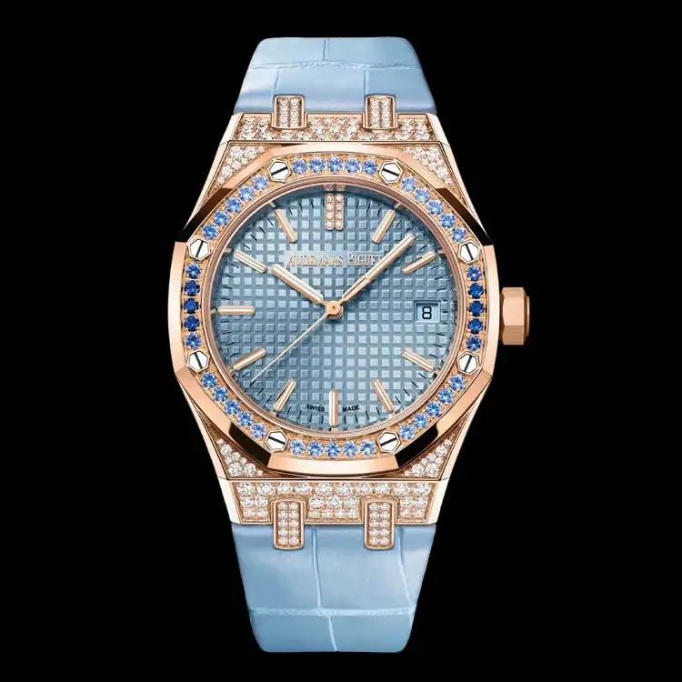 • Được làm từ vàng hồng 18 carat, gờ được nạm kim cương giác cắt rực rỡ, Mặt số màu xanh nhạt với hoa văn “Grande Tapisserie”, vạch chỉ giờ bằng vàng hồng và các kim Royal Oak có lớp phủ phát quang.