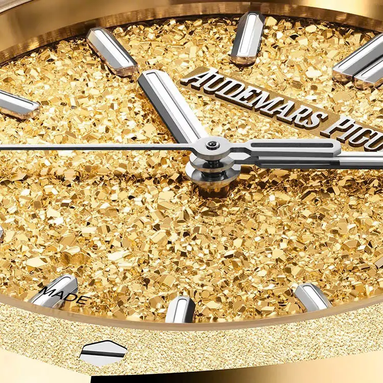 • Được làm bằng vàng 18 cara. Mặt số hoàn thiện bằng cát pha lê mạ vàng, vạch chỉ giờ bằng vàng trắng và kim Royal Oak phủ phát quang.