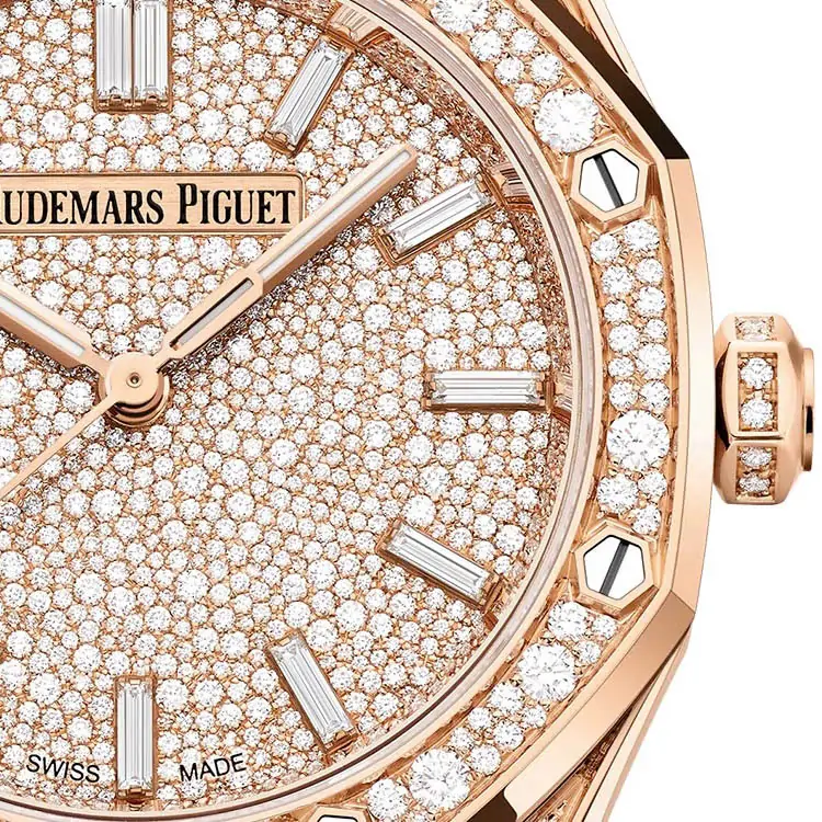 • Được làm từ vàng hồng 18 cara đính những viên kim cương cắt sáng chói, cọc số kim cương cắt baguette, vạch chỉ giờ bằng vàng hồng và kim Royal Oak với lớp phủ phát quang.