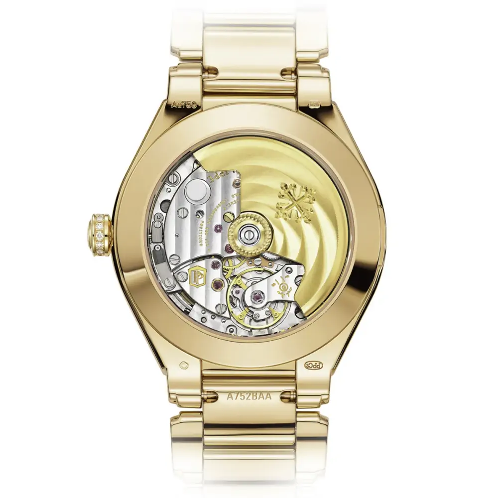 • PATEK PHILIPPE TWENTY~4 7300/1450R-001 vỏ được làm từ Vàng nguyên khối, Được lát hoàn toàn bằng kim cương, thiết lập ngẫu nhiên. 384 viên kim cương: ~2,51 ct. (quay số). 351 viên kim cương: ~1,94 ct. (hộp). 13 viên kim cương: ~0,06 ct. (vương miện). 2490 viên kim cương: ~12,7 ct. (vòng đeo tay). Tổng số 3238 viên kim cương: ~17,21 ct.