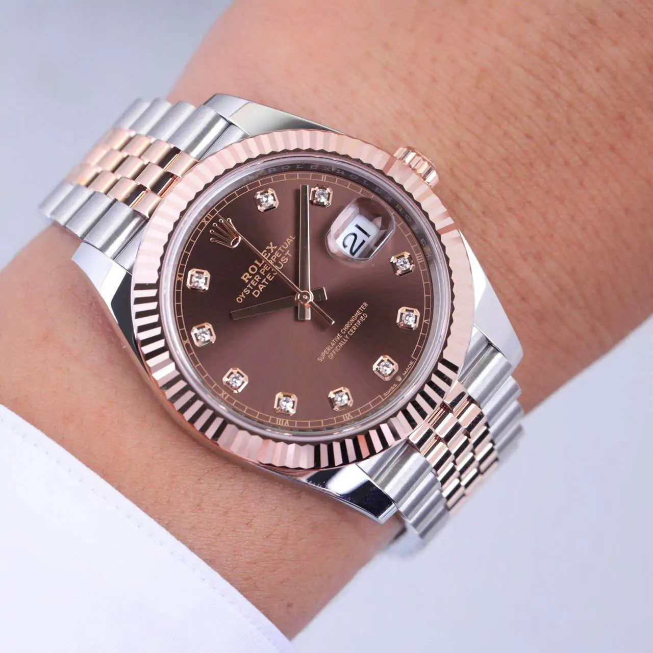 - Rolex Datejust 41 M126331-0004 có thiết kế dây đeo Jubilee, mối nối 5 mảnh chắc chắn với chất liệu Rolesor Everose - hỗn hợp thép Oystersteel và vàng Everose.