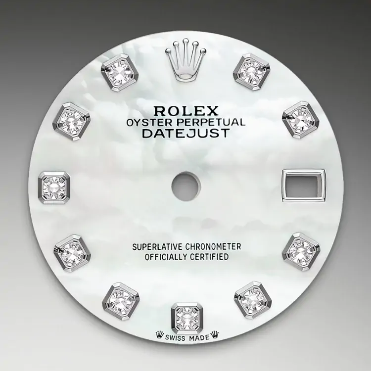- Mẫu vỏ (Case): Oyster, đường kính 28mm được làm từ chất liệu Vàng trắng 18ct. Vỏ giữa nguyên khối, nắp lưng xoắn vít và núm vặn.